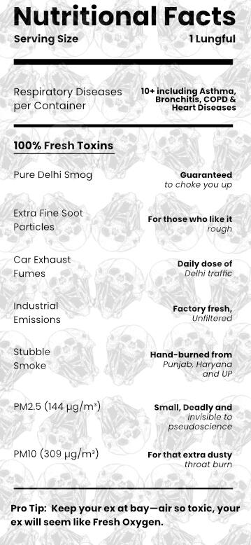 Obsessed with Toxicity, Committed to Death.Bottled at 1999+ AQI, our cans deliver an authentic Delhi experience — pure, unfiltered air laced with the world’s deadliest pollutants, reminding you of the true value of life.As you can see, we're close, but haven't hit the "Deadly Spot" yet.We’re calling on all Delhiites — step on that gas, burn up some wood, and help us share this unique gift with the world.LET'S BE A PART OF HISTORY.